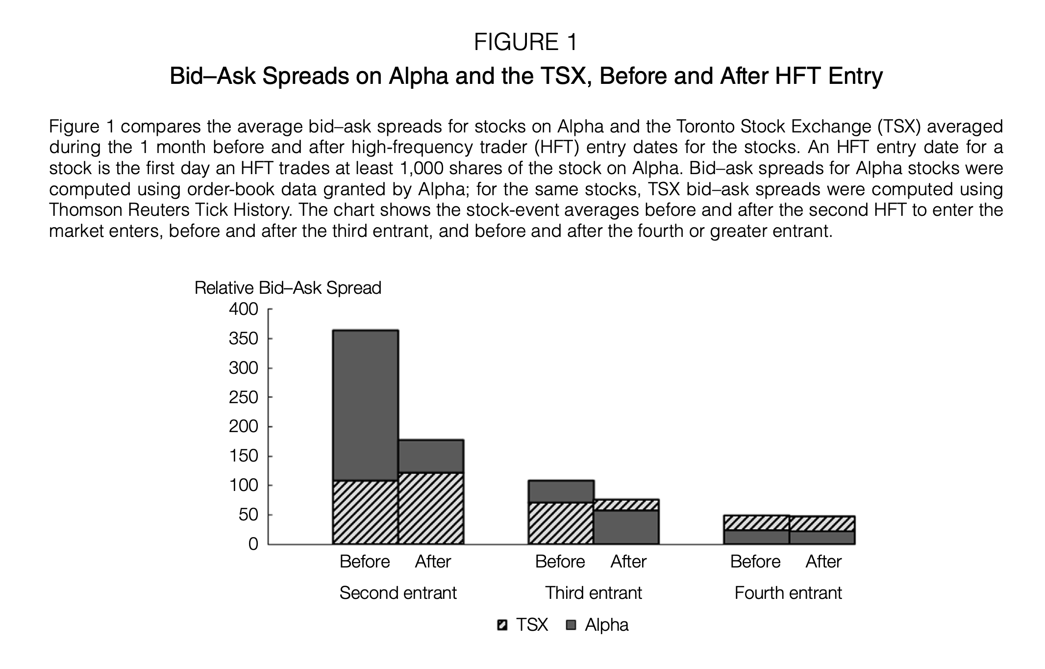 Theory on high-frequency traders (HFTs) predicts that market liquidity for a security decreases in the number of HFTs trading the security. We test this prediction by studying a new Canadian stock exchange, Alpha, that experienced the entry of 11 HFTs over 4 years. We find that bid–ask spreads on Alpha converge to those at the Toronto Stock Exchange as more HFTs trade on Alpha. Effective and realized spreads for non-HFTs improve as HFTs enter the market. To explain the contrast with theory, which models the HFT as a price competitor, we provide evidence more consistent with HFTs fitting a quantity-competitor framework.