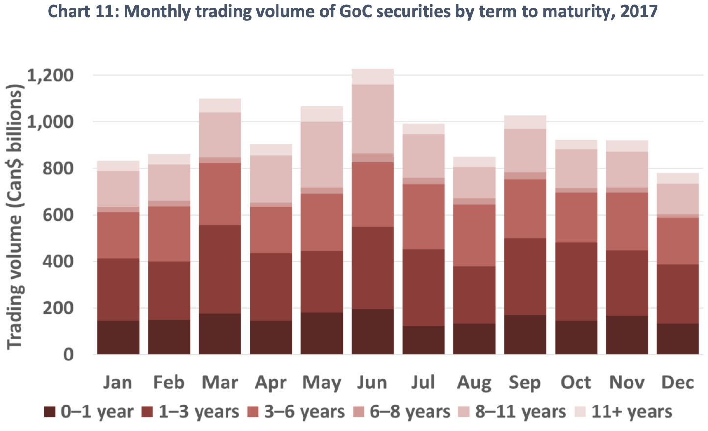 Chart 11: Monthly trading volume of Government of Canada bonds by tenor